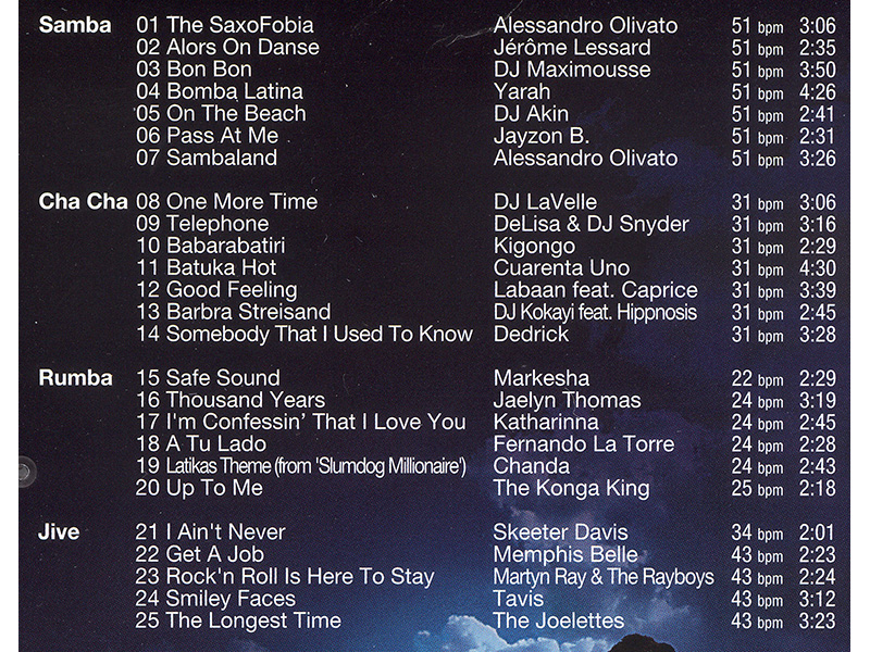 zu hören sind 25 Titel von Samba bis Jive, in unterschiedlichen Taktlängen,