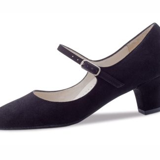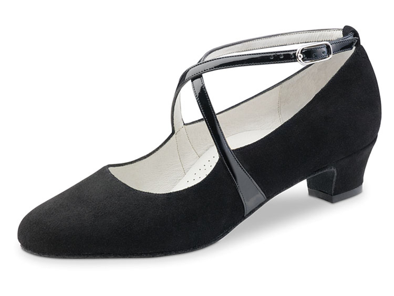 Damentanzschuh aus schwarzem Velourleder mit Lackriemchen.